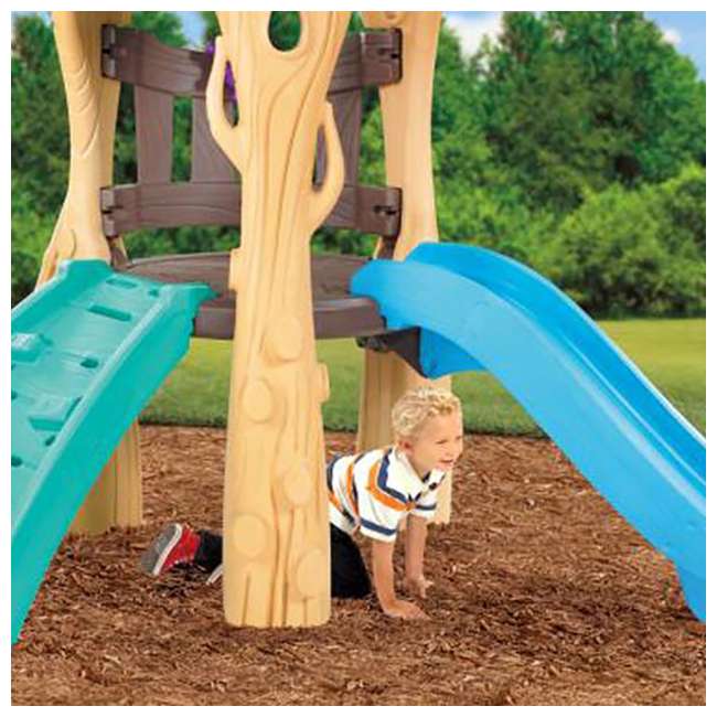 It comes with a tree house lookout spot, 2 swing seats, a rock climbing ladder and a small slide.