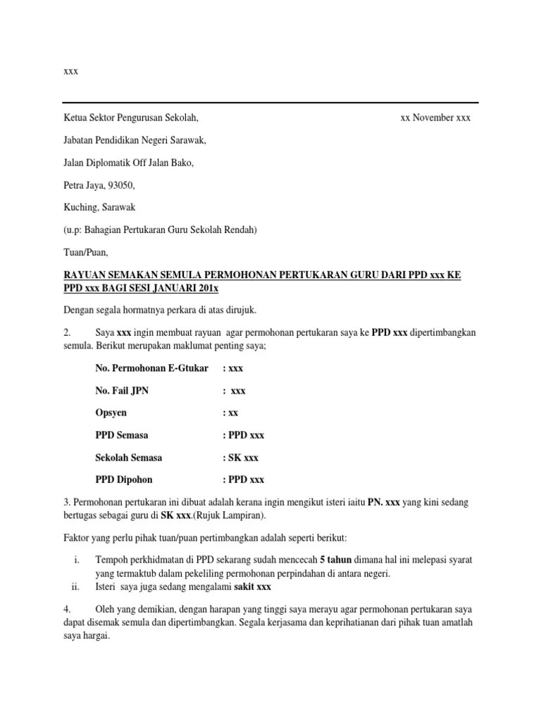 Surat Rayuan Pertukaran Guru - Dokumen Diperlukan Untuk Rayuan Pertukaran Guru : Terdapat situasi yang memerlukan penggunaan surat permohonan pertukaran tempat kerja contohnya guru ingin bertukar tempat kerja disebabkan faktor keluarga.